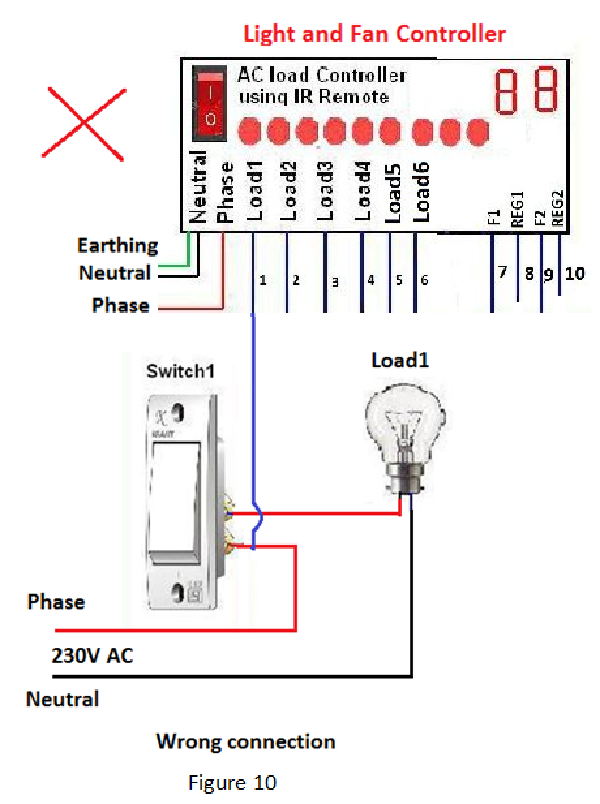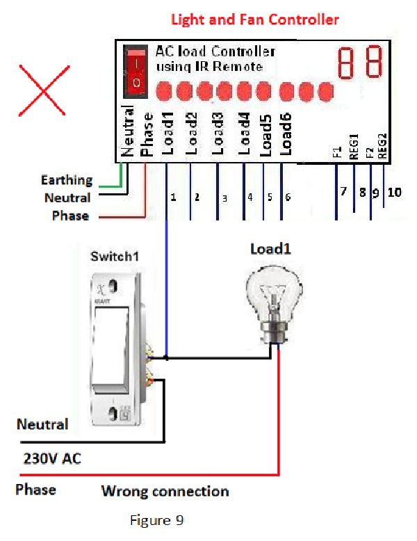 3. Before the connection of wires coming from controller with switch board, it is necessary to inspect the wiring of switch board. For right wiring the phase terminal of the main 230 volt is connected to load through an ON/OFF switch and the neutral terminal is connected directly to the Load (figure 2). In case of a wrong wiring where the phase terminal is connected directly to the load and neutral terminal is connected through ON/OFF switch, if user try to ON both of ON/OFF switch and any channel of controller then it may damage the controller. This is because when any channel of controller is ON then it provides 230V phase at its output terminal and this phase will come in contact with neutral terminal. This will lead short circuit(figure 9).