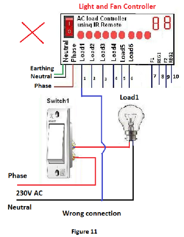5. During wiring of any output terminal of controller is connected to the neutral line then when user attempt to ON that channel, controller may be damaged due to short circuit (figure 11). The right connection diagram is shown in figure 3.