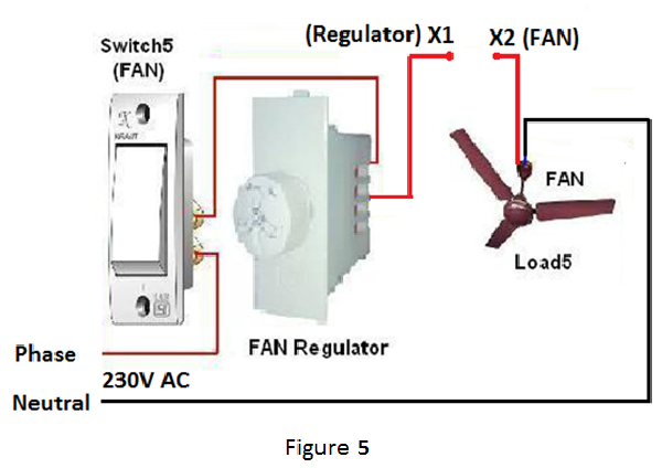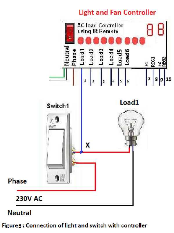 5. It is necessary to see carefully the wiring of switch1 to which you want to connect the channel number 1. In case of right wiring, one end of switch is connected to phase and other end is connected to load. The other end of load is connected directly to the neutral terminal (figure 2). Out of the different wires coming out from the controller, one wire which is marked as 1 should be connected to the one end of the switch 1 where one end of load termimal is connected (X point in figure 3).