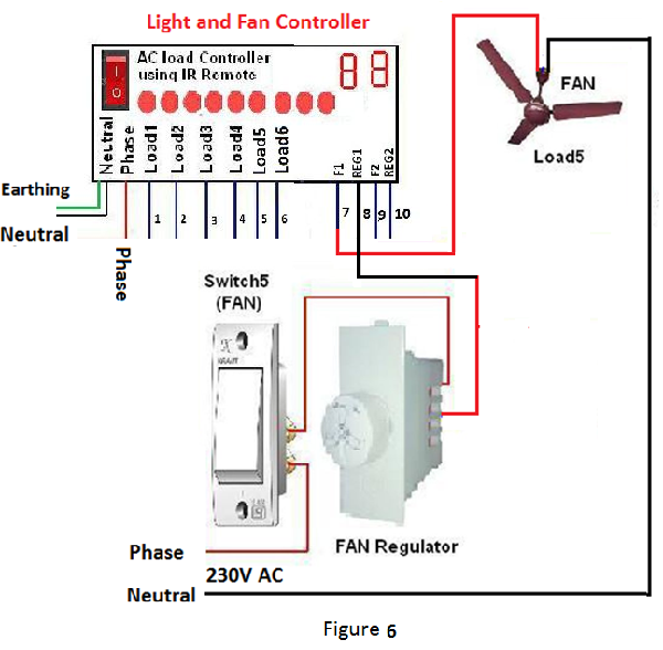 7. The channel number seven and eight are fixed for fan. Before connection of these channel it is necessary to check the wiring of fan regulator present in switch board. For right wiring, phase terminal of 230 volt mains supply is connected in ON/OFF switch and other terminal of this switch is connected in one wire of fan regulator. The other wire of fan regulator is connected to fan. The remaining terminal of fan is connected to neutral point of mains supply (figure 4). For fan1 break the wire at point X as shown in figure 4. Joint the wire from regulator side (marked as X1 in figure 5) and the wire from controller which is marked as 8. Also the joint the wire from fan (marked as X2 in figure 5) and the wire from controller which is marked as 7. Similarly, connect the fan2 with the controller.