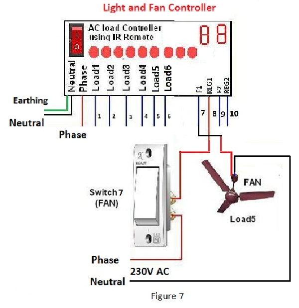 9. It is also possible to install the controller in the switch board which has only ON/OFF switch for controlling the fan (has not fan regulator). For fan1, the remove the fan terminal which is connected to switch and joint it with the wire coming from controller marked as 7. Connect the wire which is coming from controller(marked as 8) with switch. The other terminal of fan is connected to the neutral point (figure 7). Similarly, make the connection for fan2,